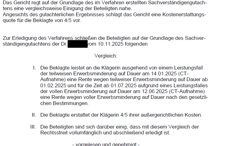 Für unsere Mandantin bedeutet dies eine wichtige finanzielle Stabilisierung – und zeigt: Eine DRV-Ablehnung ist nicht endgültig. Der Rechtsweg lohnt sich.