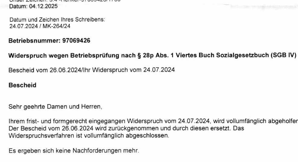 Die DRV hat den Beitragsbescheid durch Bescheid vom 04.12.2024 wieder aufgehoben. Unsere Mandantin ist damit keiner Nachforderung ausgesetzt. Das zeigt: Auch in vermeintlich „formalen“ Konstellationen lohnt sich die sorgfältige rechtliche Prüfung – gerade, wenn die DRV die fehlende Registerlage als Dreh- und Angelpunkt behandelt.